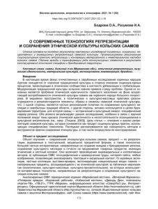 https://doi.org/10.20874/2071-0437-2021-52-1-16 Бодрова О.А., Разумова И.А. ФИЦ Кольский научный центр РАН, ул. Ферсмана, 14, Апатиты Мурманской обл., 184209 E-mail: o.bodrova@ksc.ru (Бодрова О.А.); irinarazumova@yandex.ru (Разумова И.А.) О СОВРЕМЕННЫХ ТЕХНОЛОГИЯХ РЕПРЕЗЕНТАЦИИ И СОХРАНЕНИЯ ЭТНИЧЕСКОЙ КУЛЬТУРЫ КОЛЬСКИХ СААМОВ Статья основана на последних результатах комплексных исследований письменных, визуальных, ве­ щественных и анимационных репрезентаций саамской культуры. Проанализированы региональные социокультурные практики актуализации и консервации материального и нематериального наследия кольских саамов. Сделаны выводы о трансформации ряда этнокультурных элементов в результате конструирования этнической специфики и брендирования территории. Ключевые слова: саамы, Кольский п-ов (Мурманская обл.), этнические репрезентации, визу­ альная идентичность, материальная культура, экспонирование, коммеморация, брендинг. Введение В настоящее время фокус отечественных и зарубежных исследований коренных народов Арктики смещается от изучения традиционной культуры в сторону описания социокультурных процессов, происходящих в этнических сообществах в контексте урбанизации и глобализации. Модернизация традиционной культуры кольских саамов привела к ряду проблем. Одной из ос­ новных является проблема этнической идентичности саамского населения на фоне возрас­ тающей востребованности этнической культуры саамов как коренного народа Кольского полуост­ рова. В медийном пространстве, в политических и культурно-массовых практиках (ре)кон- струируются и репрезентируются элементы, образы и символы саамской этнической культуры, что, с одной стороны, является частью региональной политики по сохранению культурного на­ следия и самобытных традиций области, с другой стороны, активно используется в целях брен- дирования территории, для которой саамы — исторический и культурный символ, специфический маркер региона. Оба аспекта актуализируют данное исследование, особенно в связи с научной полемикой вокруг темы кризиса этнической идентичности и несостоятельности эссенциализма в культурной антропологии (см., напр.: [Тишков, 2003]). Цель статьи — описание и анализ репре­ зентаций саамской культуры, которые понимаются как продукт социокультурных практик, исполь­ зующих специфические технологии. Последние рассматриваются как совокупность методов и инструментов практик сохранения этнокультуры, в том числе посредством ее конструирования. Объект и предмет исследования Объект изучения — современная этнокультура кольских саамов, предмет — ее репрезен­ тации, выраженные в текстуальной, визуальной, предметной формах, а также технологии, большей частью интерактивные, направленные на создание имиджа и брендирование региона, сохранение культурного наследия и отчасти на продвижение товарных продуктов, имеющих этнический и местный колорит. Они включают произведения индивидуальных и коллективных авторов: а) публикации СМИ, этнографические и краеведческие труды, интернет-сайты, любые изображения, позволяющие анализировать текстовый и визуальный контент; б) музейные экспо­ зиции, частные коллекции, выставки-ярмарки, экспонирующие «национальные вещи» саамов — материальные предметы, ассоциирующиеся с их этнической культурой; в) публичные мероприя­ тия (политические, культурно-