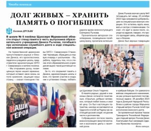 Чтобы помнили На торжественной церемонии присутствовали родные и близ кие Дениса, его одноклассники, педагоги и учащиеся школы, пред ставители администрации ЗАТО г. Североморск и жители посёлка. - Мы открываем доску, посвя щённую герою нашего времени, который оставил свою жизнь на поле сражения, защищая нашу страну, - сказал помощник гла вы ЗАТО г. Североморск Станис лав Чернавцев, обращаясь в пер вую очередь к школьникам. - Вы, ребята, гордитесь тем, что в сте нах этого образовательного учреж дения вырос такой достойный че ловек. За то, что сохраняют память о Денисе, администрацию школы и всех, кто принял участие в созда нии и установке стенда, поблаго дарила вдова военнослужащего Екатерина Рычкова. Пронзительное авторское сти хотворение, посвящённое погиб шему воину, прочитала жительни ца Щукозера Ольга Гладенко. В памяти родных, друзей и зна комых Денис останется позитив ным, открытым, добрым челове ком, который любил жизнь и знал ей цену. Он был настоящим па триотом, никогда не жаловался на трудности и погиб за Родину как на стоящий русский солдат, не уронив чести и достоинства. Собравшиеся почтили память военнослужащего минутой молча ния и возложили цветы к памят ной доске. Денис Рычков окончил школу № 6 пятнадцать лет назад. 25 октября 2022 года направился доброволь цем на специальную военную опе рацию. Его остались ждать жена, мать и сестра с племянниками. Он знал, что едет в самое пекло, но, уходя на задания, говорил, что про сто пропадает связь, оберегая род ных и близких. Денис был верным товарищем и храбрым бойцом. Он сражался в войсках специального назначения, не раз успешно выполнял постав ленные задачи. 26 декабря 2023 года в Донецкой Народной Респу блике в районе города Марьинка старший матрос Рычков погиб при исполнении воинского долга. За проявленный героизм Указом Президента Российской Федера ции старший матрос Рычков Денис Анатольевич был награждён орде ном Мужества посмертно. Фото автора. ДОЛГ ЖИВЫХ - ХРАНИТЬ ПАМЯТЬ О ПОГИБШИХ $ Евген ия ДРУЗЬЯК В школе № 6 посёлка Щукозеро Мурманской обла сти открыт стенд памяти в честь выпускника образо вательного учреждения Дениса Рычкова, погибшего при исполнении служебного долга в ходе специаль ной военной операции.