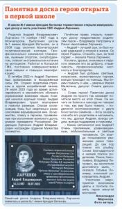 Памятная доска герою открыта в первой школеі В школе № 1имени Аркадия Ваганова торжественно открыли мемориаль ную доску в честь участника СВО Андрея Ларченко. Родился Андрей Владимирович Ларченко 14 ноября 1987 года в Мончегорске. Выпускник школы № 1 имени Аркадия Ваганова, он в 2008 году окончил Мончегорский политехнический колледж. Про фессионально занимался плавани ем, лыжным спортом, сноубордин гом, освоил экстремальное катание на мотоцикле. Работал в Кольской ГМК, постоянно совершенствовал свои навыки и повышал квалифи кацию. В октябре 2022-го Андрей Ларченко был мобилизован в Вооружённые силы РФ. Служил водителем-стрел- ком в группе истребителей танков. 26 июля 2023 года во время артил лерийского и миномётного обстрела украинскими войсками наших пози ций начался крупный пожар. Андрей Владимирович тушил возгорания и помогал раненым. Спасая сослу живцев, боец был смертельно ранен осколками взрывавшихся мин. За му жество, отвагу и героизм, проявлен ные при исполнении воинского долга, указом президента Российской Фе дерации Ларченко Андрей Владими рович награждён орденом Мужества посмертно. Почётное право открыть памят ную доску предоставили родите лям героя - Владимиру Петровичу и Раисе Николаевне Ларченко. - Андрей - лучший сын, он был на шей надеждой и опорой в жизни. Он герой Родины. Спасибо, сын, за твой подвиг, - сказала Раиса Ларченко. Коллеги, друзья, знакомые и педа гоги уважали его за доброту, отзыв чивость, профессионализм, чест ность и благородство. - Андрей был добрым, светлым, искренним, мужественным парнем, всегда приходил на помощь. Мы бу дем помнить о нём, - уверена Мария Малютина, депутат Совета депута тов. - Слава герою! Памятная доска Андрею не просто так занимает по чётное место на этой стене. Он ни чего не боялся и никогда не говорил о том, как ему было тяжело, - по делился воспоминаниями о друге Константин Семёнов. - Хочу сказать спасибо его родителям и напомнить, что мы, друзья Андрея, всегда ря дом, всегда поддержим и поможем. - Каким запомнился мне Андрей? Очень прилежным, уравновешен ным, любознательным и светлым человеком. Он всег да пользовался ува жением своих това рищей. До сих пор помню его улыбку. Слова благодарности и низкий поклон ро дителям. Раиса Нико лаевна, Владимир Пе трович, вы воспитали достойного сына, - сказала Татьяна Ло- зовер, классный ру ководитель Андрея. Участники меро приятия возложили цветы и почтили па мять героя минутой молчания. Александра Миронова. Фото автора. ЛАРЧЕНКО Андрей Владимирович 14 . 11.1987 - 26 . 07.2023 Участник специальной военной операции Вооруженных Сил Российской Федерации Указом Президента Российской Федерации Путина В.В. награжден Государственной наградой Российской Федерации Орденом Мужества" за мужество, отвагу и самоотверженность, проявленные при исполнении ИЧ воинского долга при защите „ нашей Родины посмертно Памятная д о ска Андрею Владимировичу Ларченко появилась в школе №1 имени Аркадия Ваганова.