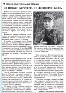 □ ГЕРОИ ОСТАЮТСЯ В НАШИХ СЕРДЦАХ ОН ПРОЖИЛ КОРОТКУЮ, НО ДОСТОЙНУЮ ж и зн ь Война - это страшная трагедия, кото рая оставляет глубокий след в душах и судьбах людей. Каждый день многие жители нашей страны задаются вопро сами: сколько ещё нам предстоит жить в постоянном страхе, сколько ещё слёз прольётся из глаз матерей, отцов, жён и детей, получивших скорбную весть, сколько боли, страданий, печали и бес конечных ожиданий мы ещё должны пережить? Война - это не просто слово, это символ страха, слёз, потерь, боли и горечи... Вновь над нашим посёлком сгусти- : лись тучи, и в дверь постучалась горест ная весть. "Погиб..." - эти слова вызыва ют слёзы, боль и пустоту в сердцах. 8 ноября на площади перед Домом ! культуры состоялся траурный митинг, посвящённый памяти гвардии ефрейто ра Кузнецова Виктора Юрьевича, наше го земляка, погибшего 30 октября 2024 года при исполнении боевого задания в ходе проведения специальной военной операции на Украине. Ему было всего 30 лет. Виктор родился 4 апреля 1994 в п.Ум- ба Терского района Мурманской облас ти. Окончил среднюю школу в Умбе. За тем поступил в филиал Ковдорского по литехнического колледжа. В 2014 году был призван в ряды Российской Армии, срочную службу проходил в мотострел- і ковой бригаде пгт Печенга. і После окончания срочной службы і Виктор Юрьевич подписал контракт и остался служить в 200-й отдельной гвар дейской мотострелковой Печенгской I ордена Кутузова бригаде. С самого на- I чала специальной военной операции на Украине принимал участие в боевых дей ствиях в составе бригады. За время службы гвардии ефрейтор Кузнецов Виктор Юрьевич был награж ден орденом Святого Георгия, Георги евским Крестом 4 степени, медалью Жукова, медалью "За отвагу", медалью "За воинскую доблесть", медалью Суво рова, медалью "Участник специальной военной операции". В день похорон Виктора пришли про ститься с ним родные, соседи, друзья, одноклассники, участники СВО и даже те, кто не был знаком с ним лично. Со болезнования семье выразили Глава Терского района Рамиля Хайруллина, заместитель министра развития Аркти ки и экономики Мурманской области Илья Остапчук, заместитель военного комиссара Кандалакшского, Ковдорско го и Терского районов, города Полярные Зори майор запаса Александр Пичугин и все те, кто пришел проводить героя в последний путь. Приносим родным и близкими Вик тора искренние соболезнования и сло ва поддержки. Разделяем с вами боль и скорбь. Виктор Кузнецов - настоящий герой, а герои не умирают, они навсегда остаются в наших сердцах. Светлая па мять воину России! Фото из открытых источников