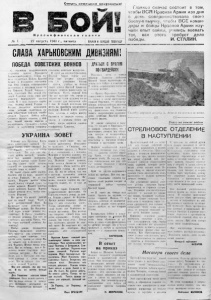 С м е рт ь н е іи е цк>ия о к к у п а я т а е й і 'Щ зё&г і*ЧіЬW І 1 К fj л с к о ф л o r с і ! а и г а з е т а 2 7 а в г у с т а 1943 г., пя тница , ПРОЧТИ И ПЕРЕДАЙ ТОВАРИЩУ I лав нее сейчас состоит в том, чтобы 8СЯ Красная Армия изо дня в день совершенствовала свою боевую выучку, чтобы ВСЕ коман диры и бойцы Красной Армии изу чали опыт войны, учились воевать так, как этого требует дело победы. и . С т а л и н . іиѵхоивямнпі СЛАВА ХАРЬКОВСКИМ ПОБЕДА СОВЕТСКИХ ВОИНОВ С. (л рошым воодушевлением I;,■ Ij;і 1111.1 II приказ Верховного г.іа >іtin 1,'t;у,ІН 1\ ЮІЦГ•0 боГщЫ 141- i i i i u . шнепня. Войска Красной \ |м ии і: результате ожесточеп- ньгх t 1 иов сломили, сопротивление іЦі; і II l’.IUII. a И ШТУРМОМ! ВЗЯЛИ г о род Харьков. Родвой Харьков' — наш. советский. Над второй етц- ,'іццеіі .Vк раины снова гордо раз венас ген ж-меркиу щес краспое знамя. И іі знак великого торже ства столица нашей Родниыі —- .М::сі; Ij а двддідатью артнллерий ■ екпми залпами салютовала на шим доблестным войскам, освобо дившим. Харьков. Победа, войск Степною фронта вызвала, у бой цов Ио'вЫ'П прилив эпермш и неудержимого стремления в боевой; учебе, и постоянном совершен-; елписанин воинского мастерства. Іі ответ па. героическую победу Кр-х-міиЛ. Армии бойцы дол* жны еще упорнее готовить себя к решающим битвам с вра.гом, \ т ііт г.ся на боевом опвгп' і : мим!! Красной Армии по- Г і ;" м ,дать немецки-фашистских за хватчиков. Пусть ісаждыін боец над раз проверит себя, хорошо ли владеет он своим оружием, все ли им сделано для подготовки себя к бою. В боевой подготовке нет места, ііп малейшим упущениям и пробелам'. Каждый моряк должен быть готовым в любую минуту броситься в жаркую схватку с врагом и одержать такую же победу, какую одержали славные освободители Харькова. УКРАИНА ЗОВЕТ Украина дала Красному Флоту много .доблестных сыновой. У к раина тстіерг, зовот: спасите! Два I I ! > теpjaoii' ірет-p.n'HYк, -с ч .іin і.'іілбаса( 11 ,'ir. Два года оніг ін»ц ют наших матерей, измыва ются над нашими дивчинами. Поливается кровыо сердце У кр ац -j пы. Она кличет своих лучших I ынов 1 и — краснофлотцев: ос вободите меня от немца! Не знают страха наши моряки. Дрались они на море, дрались и па земле. Умирали, но не еда вались. Недаром фрицы пунр' счерти., боятся «черной тучи» — наших моряков. Моряки помогли армии защитить Кавказ. Моряки пойдут впереди всех, чтобы осво бодить Украину. Мы знаем, что делает низкий враг на нашей земле. Черсн и пуст разгромленный Киев. На Крсщатнке среди развалин бес чинствуют фрицы. На Владимир* екой горке немцы вешают без защитных. В Одессе хозяйяича 101 вшивые румыны. Для ТОГО ЛИ улыбалась красавица Одесса, что бы стать вотчиной скрипача Ап тоноску? Грабят немцы плодородную Украину. Двенадцать акционер- шах обществ они устроили для грабежа: одни вывозят хлеб; другие сало, третьи — сахар. Мы пс забилтг, как в Буденовке не мец Фрилрнх Ш мидт пытал деву шек. Мы не забыли, как в Бс лополье немцы соорудили двух этажную висслину. Мы не за были, как в Житомире они зако пали живыми іі землю малых ребят. Мы но забыли, как они со,I,тли іревннй Чернигов. Мы вес помним, мы все зна* ем. И мы не можем больше ждать. Для Германии настало время расплаты. Цока немцы грабили, у них но было отказа в прияте лях. Побывали итальянцы на !fouv. пьянствовали мадьяры в в ужасе видят, что их холопы разбегаются. Итальянцы in сражались в Сицилии: они предпочитаю г траться в Милане и не с союзниками, 
