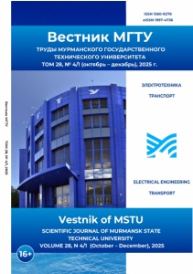 Вестник МГТУ ТОМ 28, № 4/1, 2025 ISSN 1560-9278 elSSN 1997-4736 Вестник МГТУ ТРУДЫ МУРМАНСКОГО ГОСУДАРСТВЕННОГО ТЕХНИЧЕСКОГО УНИВЕРСИТЕТА ТОМ 28, № 4/1 (октябрь - декабрь), 2025 г. ЭЛЕКТРОТЕХНИКА ТРАНСПОРТ Іі З т * Ш ELECTRICAL ENGINEERING TRANSPORT Vestnik of MSTU SCIENTIFIC JOURNAL OF MURMANSK STATE TECHNICAL UNIVERSITY VOLUME 28, N 4/1 (October - December), 2025 16 + ■