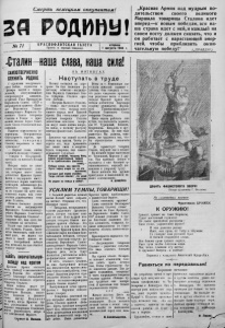 Смерть немецким оккупантам! 3 Я РОДИНЫ! № 71 К Р А С Н О Ф Л О Т С К А Я Г А З Е Т А Прочти и передай товарищу. вторник 1 августа 1944 г. ■Сталин-наша слава, наша сила! САМООТВЕРЖЕННО СЛУЖИТЬ РОДИНЕ О огромным воодушевле нием бойцы, сержанты и .'Офицеры частей и подраз делений, обслуживающих североморскую авиацию, встретили Указ Президиума Верховного Совета СССР о награждении орденам «Побе да» Верховного Главно командующего Маршала Со ветского Союза товарища Сталина и Указы о прис воении звания Героя Совет ского Союза сталинским пол ководцам . Радостно взволнованы се вероморцы. Безгран а чпая благодарность партии, пра вительству, і и в а р и щ у Сталину выражена в выс туплениях! — Первые слова любви в привета великому Сталину! — говорил т. Покровский, выступая на митинге Н-ской части. История войн не знает таких изумительных успе хов, которые имеет наша доблестная Красная Армия. Велик и неудержим насту пательный порыв советских богатырей, добывающих фа шистского зверя. Победа не за горами! Ее кует весь советски и народ под гени альным руководством това рища Сталина. Новыми боевыми делами ответим на награждение Верховного Главнокоманду ющего Маршала Советского Союза товарища Сталина!— говорили все, как один, вы ступавшие на митингах. Будем еще самоотвержен ней служить Родине, безза ветно выполнять свой воин ский долг, не жалея сил своих и самой жизни во имя быстрейшей победы над немцами, во имя счастья нашего- народа! пивать окончательную- победу над врагом Красная Армия отстояла честь, свобод^ и независимость Родиаы. Это осущест- благодаря гениальному Ріководству великого стратега товарища Сталина. Нащи войска ведут ус пешные боевые действия на территории Польши, вплот- Ую подошли к фашист скому логову. Н е д а л е к о то время, когда Красная Ар ин, руководимая и вдохпо- ляемая товарищем Сталиным * 0 ет фашистского зверя ■ 0 с°бственной берлоге. Сержант А. Волка*. Н А М ИТ И Н Г А X Наступать в труде Митинг состоялся на аэро дроме. Он был посвящен ра достному событию —награжде нию Маршала Советского Сою за товарища Сталина орде ном «Победа». —Награда Великого Сталина, — сказал выступивший тов. Новиков, —есть награда всего нашего народа, всей Красной Армии. Под гениальным руко водством товарища Сталина доблестные советские генера лы ведут наши войска вперед, на запад, к полному разгрому немецко-фашистских захватчи ков. Близится час нашей полной победы над врагом. Чтобы ус корить его, надо приложить все наши силы и энергию. Будем, товарищи, еще самоот верженней трудиться. Работай упорней, товарищ боец, Своим плодотворным трудом И ты приближаешь фашизму конец,— Победу куешь над врагом. Пусть норму вчера ты на сто выполнял, Сегодня дай норму втройне. Тогда летчик скажет: „Со мной наступал Он рядом на немца в войне*. Вслед за т. Новиковым вы ступила младший сержант т. Алисова. Она говорила о том, что радио ежедневно приносит нам радостные вести о новых победах Красной Армии. Эти победы достигнуты благодаря мудрому руководству Верхов ного Главнокомандующего Маршала Советского Союза товарища Сталина. Наша задача работать еще лучше, так выполнять задания, как тт. Туринский, Елисеев, Кудрявцева. Конькова и дру гие передовики. По ним надо равняться. Мы должны, това рищи, все трудиться так, что бы строительство закончить успешно. Да здравствует товарищ Ста