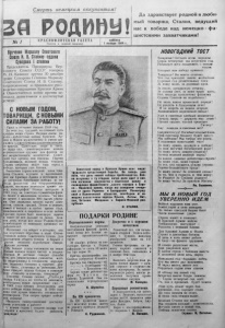 Смерть немецким оккупантам! з я г о д и н у ! № / К Р А С Н ОФ Л О Т С К А Я Г А З Е Т А Прочти и передай товарищу. суббота 1 января 1944 г. Да здравствует родной и люби- мый товарищ Сталин, ведущий нас к победе над немедко -ф а ­ шистскими захватчиками! Вручение Маршалу Советского Союза И. В. Сталину ордена Суворова I степени Председатель Президиума Вер­ ховного Совета СССР товарищ М. И. Калинин вручил 30 декабря орден Суворова I степени Маршалу Советского Союза И. В. Сталину, награжденному за правильное руко ­ водство операциями Красной Армии в Отечественной войне против не­ мецких з ахватчиков и достигнутые успехи. с НОВЫМ годом, ТОВАРИЩИ, с новыми СИЛАМИ ЗА РАБОТУ! Ушел в историю боевой 1943 год. За этот год трудный, но славный путь прошла наша страна. Верные сыны на­ рода—доблестные воины Красной Ар ­ мии и Флота мужественно и умело сра­ жались с ожесточенно-сопротивляющим- ся врагом. Советские люди в тылу, не щадя сил, самоотверженно ковали первоклассное оружие для фронта во все возрастающем количестве. Совет­ ский тыл крепок, как никогда. Партия большевиков, великий вождь товарищ Сталин уверенно ведут наш народ к юбеде, которая уже близка. Выполняя стратегический план това- эища Сталина, ведомая и вдохновляе­ мая им Красная Армия в истекшем го- _ д у одержала блестящие победы и на­ несла фашистам ряд сокрушительных V даров, поставив немецкую армию пе­ ред катастрофой. Немцы потеряли в .1943 году на советско-германском фрон- , те более 4 миллионов человек, из них ; не менее 1 миллиона 800 тысяч убиты- І ми. Они лишились многих тысяч само- * летов, танков, орудий. Летом и осенью, } зимой и весной —в любое время года, ■ закалившаяся и окрепшая в огне войны 1 Красная Армия бьет немецкую армию f' и гонит ее все дальше на Запад. Бли­ зок день, когда вся наша Родина будет освобождена от немецких кровавых по­ работителей. Истекший год войдет в историю, как год коренного перелома в ходе Отече­ ственной войны Советского Союза. Для достижения общего успеха в борьбе с ,рагом неплохо поработали северо­ горские летчики. И х боевой успех готовился на земле эуками воинов наших частей и подраз­ делений. И летчики говорят спасибо #ем, кто ремонтировал самолеты, всег­ да поддерживал в готовности аэродро­ мы, подвозил боезапас и горючее, дер­ жал связь, ухаживал за ранеными. Лет­ чики говорят нашим бойцам и команди­ рам: „Спасибо за помощь, товарищи!". Товарищ Сталин сказал: „ П о б е д а теперь б л и з к а , но чтобы ее завоевать, необходимо новое напряжение сил ...“ . В 1943 году крепко потрудились для дела победы наши бойцы. В 1944 году надо еще лучше помогать летчикам-се- вероморцам. Тем скорее придет победа над немцем! Никакого самоуспокоения достигну­ тыми успехами в работе! С новым годом, с новыми силами еще ’иорней и яростней будем работать, оварищи! Советский народ и Красная Армия ясно видят трудности предстоящей борьбы. Но теперь уже ясно, что день нашей победы приближается. Вой­ на вступила в ту стадию, когда дело идет о пол­ ном изгнании оккупантов с советской земли и ликвидации фашистского „нового порядка в Евро­ пе». Недалеко время, когда мы завершим очищѳ> ние от врага Украины и Белоруссии, Ленинград­ ской и Калининской областей, освободим от не­ мецких захватчиков народы Крыма, Литвы, Лат­ вии, Эстонии, Молдавии и Карело-Финской рес­ публики. И. СТАЛИН. ПОДАРКИ РОДИНЕ Перевыпол