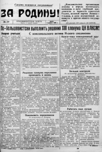 Смерть немецким оккупантам! за родину ! № 29 К Р А С Н О Ф Л О Т С К А Я Г А З Е Т А Прочти и передай товарищу. среда 4 апреля 1945 г. *Комсомольские организации должны и впредь воспитывать молодежь в духе глубокой пре данности и верности советской Родине, великой партии Ленина— Сталина, в духе неукротимой не нависти к врагам нашего государ ства и (Из решений, XIII пленума ЦК ВЛКСМ). По-большевистскивыполнитьрешенияXII пленума ЦКВЛКСМ! Упорно учиться Большой след is жизни на ших частей и подразделений должно оставит прошедшее со брание комсомольского актива. На нем подробно обсуждались основные задачи комсомольцев, цолодежи на данном этапе Отечественной войны. Говори ли о значении решений X III пленума ЦК ВЛКСМ и о том, как их реализовать. Пленум призвал „всех ком сомольцев и молодежь новыми ратными и трудовыми подви гами приблизить час оконча тельной победы над немецко- фашистскими захватчиками*. У нас есть яркие проявле ния самоотверженного труда. Работая на снегоуборке, тт. Рѵ- пасов и Скобелев выполняют по две нормы. Ремонтник са молетов т. Страшный система тически выполняет норму вдвойне и дает высокое каче ство исполнения. Большие успехи у комсо мольцев и молодежи по осу ществлению исторического при каза № 5 товарища Сталина. Нона этих успехах не следует успокаиваться и зазнаваться. Нужно идти к новым дости жениям, путь к которым через всемерное улучшение массовой политико-воспитательной рабо ты среди молодежи. Чтобы не отстать от жизни, а тем более умело руководить молодежью, надо самим упорно учиться,—отмечали в прениях комсомольские активисты. Эта истина очевидна. Товарищ Сталин указывал: «Терпеливая и настойчивая ленинская учеба — таков тот чуть, которым должен пройти актив комсомола». Реализация решений X III пле нума ЦК ВЛКСМ, успешно на чалась во многих комсомоль ца х организациях. Созданы кружки по истории партии, Русского языка, географии, проводятся систематически лек- Ми, развивающие у личного состава политический и обще образовательный кругозор. Но сделано еще мало. Это только начало большого воспитатель н о процесса, в котором впд- НУ 10 роль играет комсомоль ский актив. Близка победа над гитлеров цами. Почетны задачи комму нистического воспитания. _ Комсомольскне активисты, омните, что надо помочь ра зораться в важнейших поли- ических вопросах тем товари щам, которые не имеют доста- чной общеобразовательной и олнтичсской подготовки. Ра- ъи? с ними~ в центр своего Цмания. А чтобы она была Тлетворной, комсомольский к и в н е т ,- у п о р н о учись! С комсомольского актива Н-ского соединения На-днях в нашем соединении состоялось со брание комсомольского актива, посвященное ре шениям XIII пленума ЦК ВЛКСМ. По докладу т. Пильвицкого разверну тісь оживленные пре ния. Выступающие тт. Корягин, Лившиц, Ко маров, Руднев, Постникова и другие говорили о положительных сторонах и недостатках в проведении массовой политико-воспитательной работы среди молодежи, и в осуществлении комсомольцами авангардной роли. Собрание комсомольского актива приняло решение, направленное на выполнение постанов лений XIII пленума ЦК ВЛКСМ. Показывая новые высокие образцы выполне ния приказа № 5 Верховного Главнокомандующего Маршала Советского Союза товарища Сталина, комсомольцы-воины будут неуклонно повышать свою авангардную роль. Об этом стремлении воспита