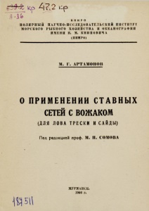 5. Артамонов, М. Г. О применении ставных сетей с вожаком : (для лова трески и сайды) / М. Г. Артамонов ; под ред. проф. М. П. Сомова ; Поляр. науч.-исслед. ин-т морского рыбного хоз-ва и океанографии им. Н. М. Книповича (ПИНРО). - Мурманск : тип. "Полярная правда", 1946. - 31 с.