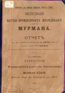 Брейтфус, Л. Л. Экспедиция для научно-промысловых исследований у берегов Мурмана : отчет по ее деятельности за 1902 г. начальника экспедиции Л.Л. Брейтфуса / Л. Л. Брейтфус ; Ком. для помощи поморам Рус. Севера. – Санкт-Петербург : Тип. И. Гольдберга, 1903. -Х, [2], 327, [3], 218 с., [12] л. табл., [3] к., 88 рис.
