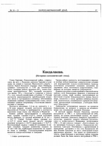 Кандалакша. (Историко-экономический этюд). Север Карелии—Кандалакшский район, соприка саясь на юге с Лоухским районом Карелии и упи раясь на севере в границы Мурманского округа— южные берега большого водоема озера Имандры, занимает пространство в 7.757 кв. километров. Часть площади района, примерно 20°/0, занята вод ными пространствами, 5О°/0 площади находится под лесом, 29°/0— болотами и тундрами и только 1°/0—под сельско-хозяйственн. угодиями *). Рельеф местности характеризуется преобладанием покры тых лесом и кустарником и усеянных обточенными ледниками камнями возвышенностей—сельг, всхол мленных гривков вперемежку с болотными низмен ностями и озерами. Плотность населения— 1,4 на кв. километр, т. е. в 24 раза меньше средней плотности населения Европейской России, и приближается к плотности населения таких стран, как Швеция и Норвегия. Климат района представляется в следующем виде: средняя годовая -f- 0,3° С; самый холодный месяц—февраль, со средней месячной за 10 лет — — 12,7° С. Самый теплый — июль, средняя его 14,7° С, после июля следует август, средняя месячная которого 13,0° С, далее июнь с -f- 10,7° С. Вегетационный период—с июня (И половина) п о к а чало сентября. Среднее количество осадков за 10 л е т—326 мм.; наибольшее количество их падает на июль и сентябрь. Господствующими ветрами являются северо-восточные и северные. t) Цифры ориентировочны е. Чрезвычайная краткость вегетационного периода и вообще неблагоприятные климатические условия для выращивания сельско-хозяйственных культур естественно устремляют внимание населения на изыскание иных источников существования, глав нейшим из которых является рыболовство. Административно-хозяйственный и бытовой центр района—село Кандалакша (финское, в переводе на русский—конец, край залива), расположенное на восточной стороне Кандалакшского залива Белого моря, относится к числу древних северных поселе ний, окончательно сложившихся в результате бо яр ской, промысловой колонизации „Господина Вели кого Но в го р о д а11. Любопытно остановиться немного на прошлом Кандалакши, на вопросе о времени ее возникно вения как поселенной единицы Поморья. В местной церкви Иоанна Предтечи, начатой постройкой в 1786 г. и представляющей из себя, правда, не совсем законченный (купол), но х ар а к терный памятник типичного северного деревянного зодчества, хранится грамота епископа архангель ского и холмогорского Вениамина, датированная 1780 г. В ней епископ говорит: „Благословили мы по прошению Кольского уезда с. Кандалакши свя щенника Григория Плотникова с причетниками и прихожаны построить в том селе Кандалакша во имя Иоанна Предтечи на месте обветшалой новую деревянную ц ерко в ь1. Как видно из приведенного текста, существующая в настоящее время ц ерковь должна была бы быть начата постройкой в 1780 г.