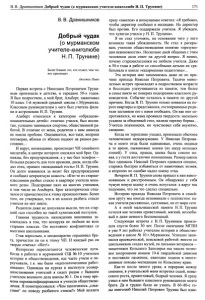 В. В. Дранишников Добрый чудак (о мурманском учителе-книголюбе Н. П. Трунине) 171 В. В. Дранишников Добрый чудак (о мурманском учителе-книголюбе Н. П. Трунине) Более блажен тот, кто отдает, чем тот, кто принимает. Апостол Павел Первая встреча с Николаем Петровичем Труни- ным произошла в детстве, в середине 50-х годов. Я был подростком, а мой брат, Альберт, заканчивал 10 класс 1-й мужской средней школы г. Мурманска. Классным руководителем у него был учитель физи ки и астрономии Н. П. Трунин. Альберт относился к категории «образцово- показательных детей»: отлично учился, был воспи тан, успешно занимался спортом, общественной ра ботой. В отличие от меня, родители с ним никогда не имели проблем. Оказывается, все-таки, вопреки поговорке, яблоки от яблони падают на разное рас стояние. .. И вдруг, неожиданно, происходит ЧП семейного масштаба, в центре которого оказался мой брат. Од нажды, без предупреждения, а у нас был телефон — большая редкость для того времени, днем, когда обе дал отец, пришел «нежданный гость» Н. П. Трунин. Он долго извинялся за визит без предупреждения и сообщил неприятную новость: «Кто-то из старше классников разбил стекло в квартире учителя воен ного дела». Подозрение пало на многих учеников, в том числе на Альберта. Брат категорически отка зался от причастности к этому происшествию. Более того, он утверждал, что в их классе разбить стекло учителя не мог никто. Родители даже не допускали мысли, что их стар ший сын способен на такой хулиганский поступок. Главная трудность нахождения виновника за ключалась в том, что военрука не любили во всех старших классах. Он постоянно конфликтовал со многими школьниками. Став взрослым, я неоднократно спрашивал бра та, причастен ли он к этому ЧП. И каждый раз он твердо отвечал: «Нет!» Интересно переплетаются человеческие пути. Когда я работал в мурманской СЩ № 10 учителем истории и обществоведения, нас часто учили и пе реучивали, т. к. мы были «идеологическими работ никами». Однажды на курсах в институте усовер шенствования учителей я сидел рядом с бывшим учителем военного дела школы № 1. Он к тому вре мени переквалифицировался в учителя обществове дения. Я поинтересовался: «Чем закончилось „след- ствие“ по поводу разбитого стекла?» Мой коллега сразу «завелся» и возмущенно ответил: «Я требовал, чтобы директор сообщил в милицию. Но директор был против. Его поддержали учителя. Я убежден, что хулиган учился у Н. П. Трунина». Я не стал уточнять, на основании чего у него возникла такая убежденность. Не стал я раскры вать учителю обществоведения понятие «презумп ция невиновности». Несколько дней общения с этим человеком дали ответ на другой вопрос. Я понял, почему старшеклассники не любили учителя. Даже в 50-е годы в работе со способными детьми не сра батывала в школе «казарменная педагогика»... Эта история мне запомнилась даже не по при чине прихода Николая Петровича. Тысячи мимо летных встреч происходят в подростковом возрасте и бесследно улетучиваются из памяти, тем более в семье никто не поверил подозрению классного ру ководителя. Событие осталось в памяти по другой причине. Когда Н. П. Трунин только появился на по роге квартиры и представился, гостеприимные роди тели заставили его с нами отобедать. Он как мог со противлялся, но мама проявила твердость: насильно усадила за обеденный стол, налила тарелку б