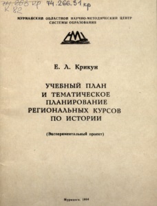 Крикун, Е. Л. Учебный план и тематическое планирование региональных курсов по истории : (экспериментальный проект) / Крикун Е. Л. ; Мурм. обл. науч.-метод. центр системы образования. – Мурманск : [б. и.], 1994. – 41 с.