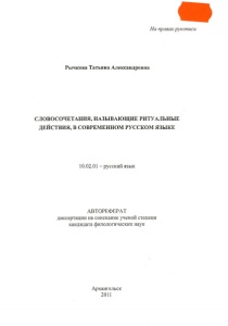 Рычкова, Т. А. Словосочетания, называющие ритуальные действия, в современном русском языке : автореферат диссертации на соискание ученой степени кандидата филологических наук : 10.02.01 - русский язык / Рычкова Татьяна Александровна ; [Белгород. гос. ун-т]. - Архангельск, 2011 (Мурманск : МГГУ). – 15 с., включ. обл.