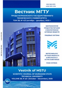 Веотник МГНУ НОМ 28, Z 4/2, 2025 ISSN 1560-9278 elSSN 1997-4736 Веотник МГНУ ТРУДЫ МУРМАНСКОГО ГОСУДАРСТВЕННО ГО ТЕХНИЧЕСКОГО УНИВЕРСИТЕТА НОМ 28, Z 4/2 (октябрь - декабрь), 2025 г. БИОТЕХНОЛОГИЯ ПРОДУКТОВ ПИТАНИЯ И БИОЛОГИЧЕСКИ АКТИВНЫХ ВЕЩЕСТВ ПИЩЕВЫЕ СИСТЕМЫ пЖ г 10 BIOTECHNOLOGY OF FOOD PRODUCTS & BIOLOGICALLY ACTIVE SUBSTANCES FOOD SYSTEMS Vestnik of MSTU SCIENTIFIC JOURNAL OF MURMANSK STATE TECHNICAL UNIVERSITY VOLUME 28, N 4/2 (October - December), 2025