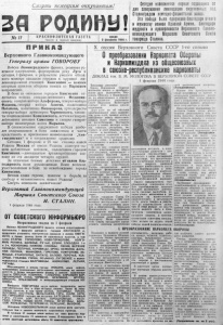 Смерть немецким оккупантам! З А Г О Д И Н У ! № 11 К Р А С Н О Ф Л О Т С К А Я Г А З Е Т А Прочти и передай товарищу. ереда 2 февраля 1944 г. Сегодня исполняется первая годовщин дня завершения ликвидации округам ; Сталинградом немецко-фашистских войск. Эта победа была одержана благодаря отваге и мужеству воинов Красной Армии, благодаря мудрости и прозорливости Верховного Глашт- комаидующего Маршала Советского Союза товарища Сталина. ПРИК А З Верховного Главнокомандующего Генералу армии ГОВОРОВУ Войска Ленинградского фронта, развивая ус ­ пешное наступление, форсировали реку Луга и сегодня, 1 февраля, в результате умелого обход ­ ного маневра овладели городом и крупной же ­ лезнодорожной станцией Кингисепп — важным опорным пунктом обороны немцев на Нарвском направлении. В боях за овладение городом Кингисепп о т ­ личились войска генерал-лейтенанта Федюнин- ского , генерал-майора Альферова , генерал-майора Фадеева, генерал - майора Алиева, полковника Потапова, полковника Никонорова , артиллеристы генерал-майора артиллерии Чарнявского , танкис­ ты подполковника Ковалевского , летчики генерал- лейтенанта авиации Самохина и саперы генерал- майора инженерных войск Марьина . В ознаменование одержанной победы наибо­ лее отличившиеся в боях соединения и части представить к присвоению наименования „Кин­ гисеппских" и к награждению орденами. Сегодня, 1 февраля, в 21 час столица нашей Родины Москва от имени . Родины салютует-на ­ шим доблестным войскам, овладевшим городом Кингисепп,— двенадцатью артиллерийскими зал­ пами из ста двадцати четырех орудий. За отличные боевые действия обявляю бл а ­ годарность всем , руководимым Вами войскам, участвовавшим в боях за освобождение города Кингисепп. Вечная слава героям, павшим в борьбе за свободу и независимость нашей Родины! Смерть немецким захватчикам! Верховный Главнок омандующий Маршал Советского Союза И . СТАЛИН . 1 февраля 1944 года. ОТ СОВЕТСКОГО ИНФОРМБЮРО Оперативная сводка за 1 февраля В о й с к а Л Е Н И Н Г Р А Д С К О Г О фронта, с л о м и в с о п р о т и в л е н и е п р о т и в н и к а , 1 ф е в р а л я о в л а д е л и го р о д о м К И Н Г И С Е П П и, п р о д о л ж а я р а з в и в а т ь н а с т у п л е н и е с е вер нее и ю н т е е К И Н Г И ­ СЕПП , с бо ями з а н я л и более 50 н а с е л е н н ы х п у н к т о в , в том чиоле С Т А Р О Е Г О Р К О Л О Б О , Н О В О -Г О Р К О Л О В О , К О Л Г О - М И Я . Р Е П И Н А , З А Л Е С Ь Е , Р У Ч Ь И , Д У Б К И , С Л О Б О Д К А 1-я и 2-я, К О С К О Л О В О , Н И Ж Н И Е Л У Ж И Ц Ы , П Е С К И , В Е Р Х Н И Е Л У Ж И Ц Ы , П О Л У Ч Ь Е , К У Р О В И Ц Ь І , О Р Л Ы , К Е Й К И Н О , Д А Л Ь ­ НЯ Я П О Л Я Н А , M A H H O B K A , ГО Р Е Л О В О . Л О Ж Г О Л О В О , З А - М О Ш Ь Е , С Т А Р О П О Л Ь Е , Х А Т И Л О , В А Л О В О , П О Р Е Ч Ь Е , У С А - Д И Щ Е , Г Л А З О В А Г О Р К А , О С ь М И Н О , Л У Г О В С К О Е и ж е л е з ­ н о д о р о ж н ы е с т а н ц и и В А Л Г О В И Ц Ы , К О С КО Л О В О , Л Е Т Н Я Я , Т У Г А Н Ы . Ю го -з а п а д н е е и ю ж н е е го р о д а Л К З Б А Н Ь н а ш и вой с ка , п р е о д о л е в а я и н ж е н е р н ы е з а г р а ж д е н и я п р о т и в н и к а х а л е с н ы х д о р о га х , с боями п р о д в и г а л и с ь в п е р е д и з а н я л и н а с е л е н ны е u £ HD m J J ^ P , C E /1 0 H Н О В И Н Н А , Г Л У Б О Ч К А , А П Р А К С И Н БОР, Л У Н А , Ч Е Р В И Н О , К Р А П И В Н О , К Р У Т И К , В И Н К А О Л Ь Х О В С К И Е и ж е л е з н о д о р о ж н у ю с т а н ц и ю НО- З а п й д н е е Н О В Г О Р О Д А н а ш и в о й с к а п р о д о л ж а л и в ести н а с т у п а т е л ь н ы е бои, в ходе к о т о р ы х з 