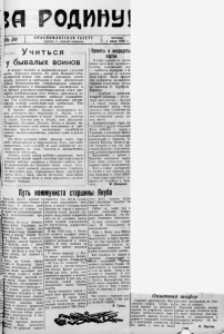 К Р А С Н О Ф Л О Т С К А Я Г А З Е П рочти и передай товарищу. . У ч и т ь с я — - I у бывалых воинов В наш и х ч а ст я х и п о д р а з д е л е н и я х служит много бы в а лы х воинов. З а годы Вели кой Отвт чественной войны они много в л ож и л и своего труда, у м е н и я и см е к а л к и в дело обеспечения боевой д е ят е л ь н о ст и североморской авиации. На а э р о д р ом а х ; в а виационны х мастерских и на дру гих у ч а с т к а х передовые воины своим при- і пером в о о д уш е в л я л и всех бойцов, призывали и х I к от личному выпо лн ению заданий командова- \ ния. Так создавались у с л о в и я , которые обеспе- jl кивали победу североморским летчикам . Так ; победа в в о з д у х е ковалась на земле . 1 В первых р я д а х боевых помощников на- I тих л ет ч и к о в ш е л старшина т. Якуба , о ко- 1тором ра с ска зы ва ет в своей заметке военкор т. Гринь. Т а кж е к а к и Я куба , тт. Ш а л а п о в , Шурыгин, Л а з а р е в > Козлов . Лесин и многие др. на прот яж ении всей войны повседневно и кро ­ потливо т р у д и ли с ь , настойчиво овладевали своими сп ец и а л ьн о ст ям и , у ч и л и с ь сами и у ч и л и других. И х д е л а я в л яют собой пример того, ка к , надо относиться к порученному делу , как надо выполнять свою с л уж б у во имя интересов на­ шего народа , во им я счастья и процветания советской Отчизны. Сейчас , когда война победно завершена, тем с большей си лой перед каждым краснофлотцем встает з а д а ч а—учить ся у бывалых воинов, ши­ ре перенимать и х богатый опыт, лучше овла ­ девать своей военной специальностью Учиться, не п о к л а д а я р у к , стремиться быть мастером I своего д е ла с тем, чтобы достойно выполнять свои служебный долг и тем оправдать высокое доверие Родины. Т А пятница 1 июня 1945 г. Приняты в кандидаты партии В нашу партийную орган j нацию поступили заявления с лучших комсомольцев част — сержантов Хороброва и Ш реліша о приеме и х : в канди даты партии. После оформле ния документов, на партийно собрании коммунисты обсуди ли заявления тт. Хороброва Корелина. — Хоробров — примерны младший командир,— сказал своем выступлении т. Быстров —С самого начала Велико] Отечественной войны честн выполнял свои служебные обя занностп по обеспечению бое b u m имуществом наших лет ных частей. Положительными были вы ступления и других товарищей После решения о приеме т Хороброва в кандидаты ВКП(б) собрание не] ешло к обсуждении кандидатуры т. Корелина. То варищи Королев, Арте'ев и дру гие говорили о том, что ком сомолец Корелин—исполнитель­ ный,.дисциплинированный воин Предложение о приеме т Корелина кандидатом парки было также единогласно под­ держано всеми коммунистами Итти к новым достижения» в службе и тем оправдать зва­ ние кандидата в члены ВКІІ(б —таков наказ партийного со­ брании тт. Х'ороброву и Коре- липу. М. Шиндяѳв. й' Николай ІІИіЩу MlH'Tt году. Путь коммуниста старшиныЯкуба Якуба прибыл в молодым бойцом в С первых дней йоей службы он показал се- • {я одним из дисциплинирован­ ных и исполнительных кра­ снофлотцев. Началась Великая Отечест- ^нная война. Вероломно на­ евшие на нашу страну не- вцко-фашистские захватчики вались к центру нашей Ро- Яны—Москве. Они вторглись 1 Украину, заняли Чернигов­ ом) область, неся с собой Іерть и разрушение. Эта же йсть постигла и село Сере­ д к у—место, где родился и ,;->Рос Якуба. Mi- Здесь, на Севере, немцы йе»нёВались к Мурманску. Наши ѴР»КИ, пехотинцы и летчики есдоЩью св